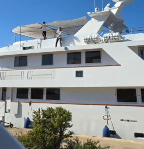 This photograph, taken from a nearby yacht, shows crew members working aloft without visible fall arrest equipment (e.g., harness, safety line) or other PPE.